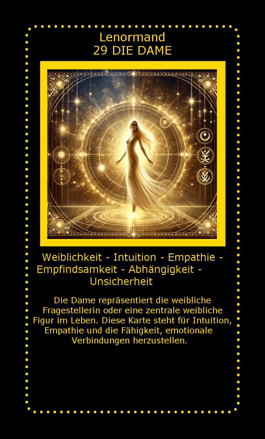 Die Dame repräsentiert die weibliche Fragestellerin oder eine zentrale weibliche Figur im Leben. Diese Karte steht für Intuition, Empathie und die Fähigkeit, emotionale Verbindungen herzustellen.