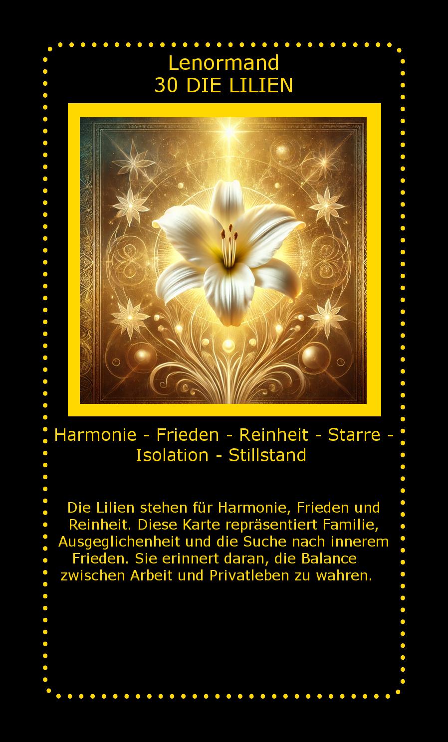 Die Lilien stehen für Harmonie, Frieden und Reinheit. Diese Karte repräsentiert Familie, Ausgeglichenheit und die Suche nach innerem Frieden. Sie erinnert daran, die Balance zwischen Arbeit und Privatleben zu wahren.