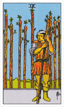 Die Person auf dieser Tarotkarte trägt einen Kopfverband, was auf eine seelische alte Wunde hindeutet. Dies kann eine unglückliche Liebe oder eine Kränkung sein. Er klammert sich an seinen Stab und hat einen Schutzzaun aus Stäben aufgestellt. Er isoliert sich von seiner Umwelt und baut sich selbst ein Gefängnis. Die Wunde ist geheilt, es ist an der Zeit, den Verband wieder abzunehmen und wieder mutig in die Welt hinaus zu treten. Es ist die Angst vor weiteren Verletzungen. Bei einer unglücklichen Liebe hat die Person vielleicht Angst vor einer weiteren Enttäuschung und ist deshalb noch nicht bereit, sich auf eine neue Beziehung einzulassen. Im Beruf hat man vielleicht mit einem unglücklichen Arbeitsumfeld zu tun gehabt und scheut sich deshalb, neue Risiken oder Herausforderungen in Angriff zu nehmen. Die Karte Neun der Stäbe vermittelt durch seine sehr klare Bildsprache eine Situation, die jeder von uns kennt – die übertriebene Angst vor dem Neuen aufgrund von negativen Erfahrungen in der Vergangenheit. Gegen diese ängste gilt es wieder mit neuem Mut vorzugehen.