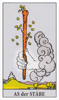 Das Ass der Stäbe steht für Zeugung und Potenzial. Die Karte symbolisiert die Kraft der Inspiration, aus der neue Taten resultieren. Das Ass der Stäbe steht darum auch für Glück und Neuanfang. Gelegentlich warnt sie uns, eine Gelegenheit nicht verstreichen zu lassen sondern schnell zuzugreifen. Sie erinnert uns ausserdem daran, unser Glück täglich neu zu schmieden. Wir haben können Freude und Spass an unseren gesteckten Zielen, unserer Persönlichkeitsentfaltung und der Bahnung eines erfolgreichen und glücklichen Lebenswegs haben. Dazu müssen wir aber erst lernen, das Leben immer etwas positiver zu sehen, als es auf den ersten Blick erscheint. Cape Diem – Nutze den Tag und Deine Lebenskraft. Die Karte verlangt von uns Aktivität und Lebensbejahung. Wir müssen unsere Talente und unser Glück ergreifen und aktiv damit umgehen – sonst entgeht uns die Chance unsere Persönlichkeit und unser Wohlbefinden auf das notwendige Niveau zu heben.
